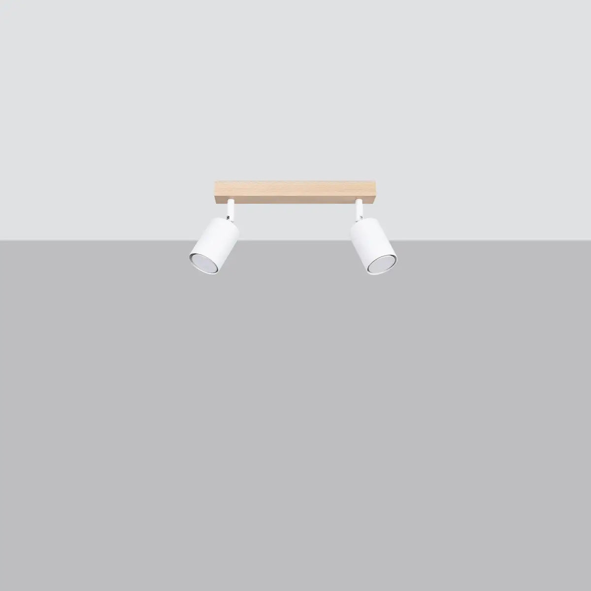 Moderne Holz-Stahl Deckenleuchte mit zwei runden Holzspots in Weiß und Naturholz – für einen eleganten, natürlichen Lichtakzent in minimalistischen und loftartigen Interieurs.
